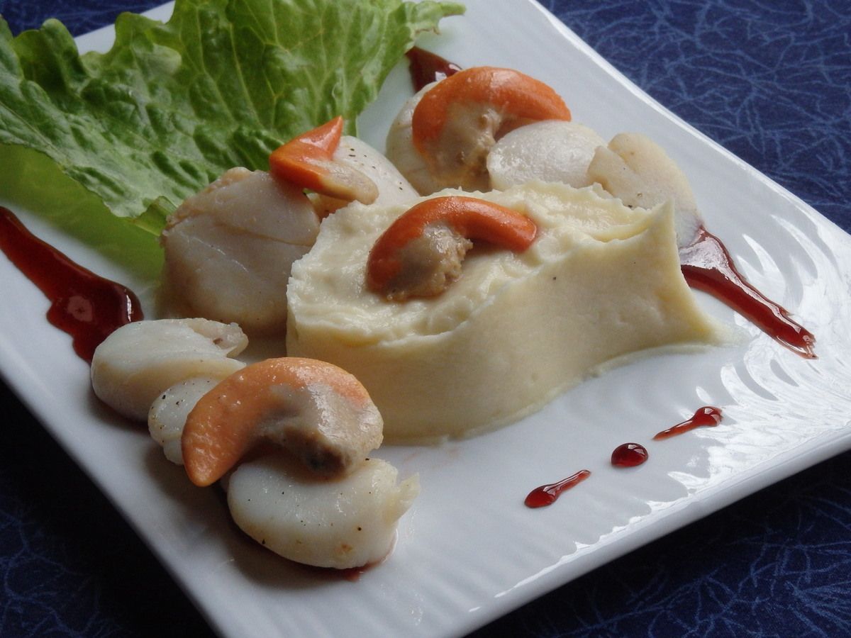 Coquilles Saint Jacques rôties, purée de panais et caramel au vinaigre de framboise