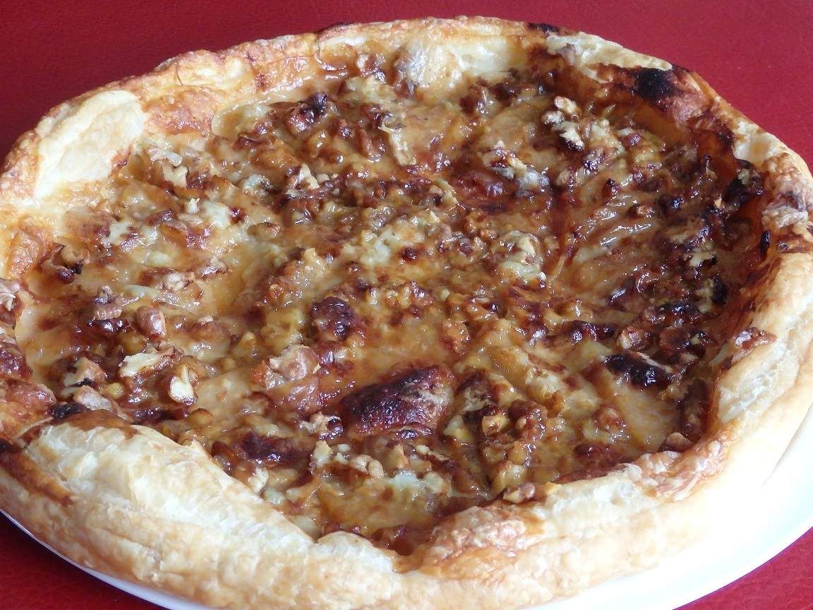 5 - Disposez harmonieusement les lamelles de poires égouttées sur la pâte, émiettez le fromage gorgonzola dessus et arrosez du jus de cuisson des poires et répartissez les cerneaux de noix concassés.